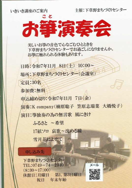 下草野まちづくりセンターでは、【お箏演奏会】を開催します。