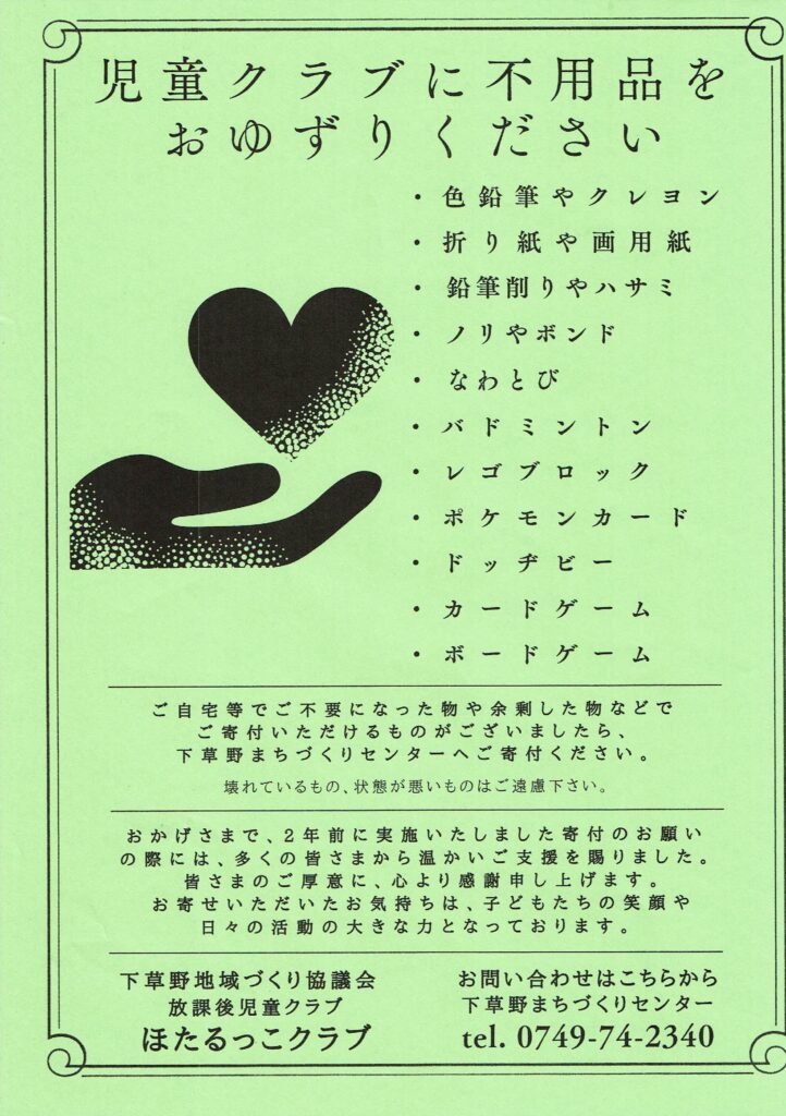 地域の児童クラブ「ほたるっこクラブ」では、家庭で眠っている不用品のご寄付を募集しています。